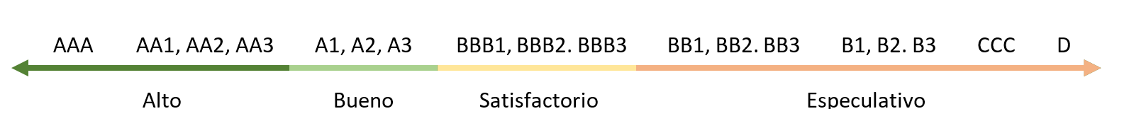 Las calificaciones de riesgo son representadas por letras (desde D hasta AAA) y en un nivel que va desde “Alto” hasta “Especulativo”.
